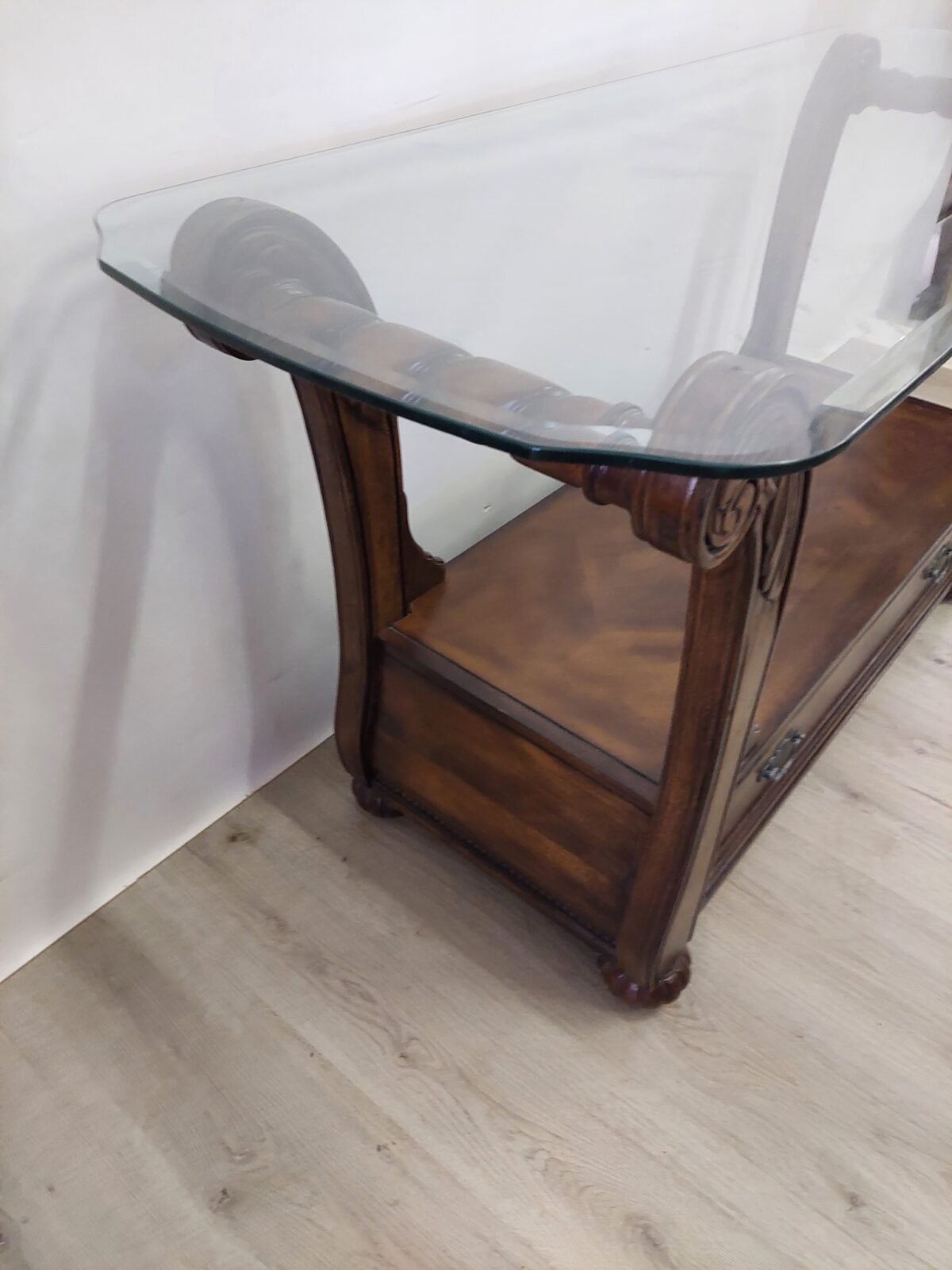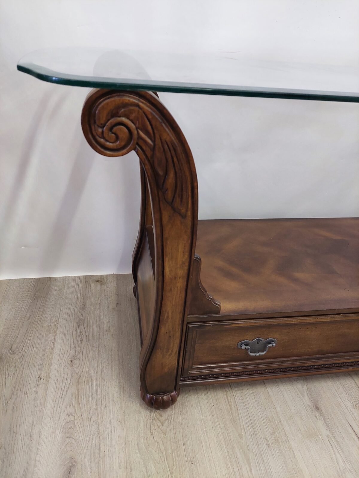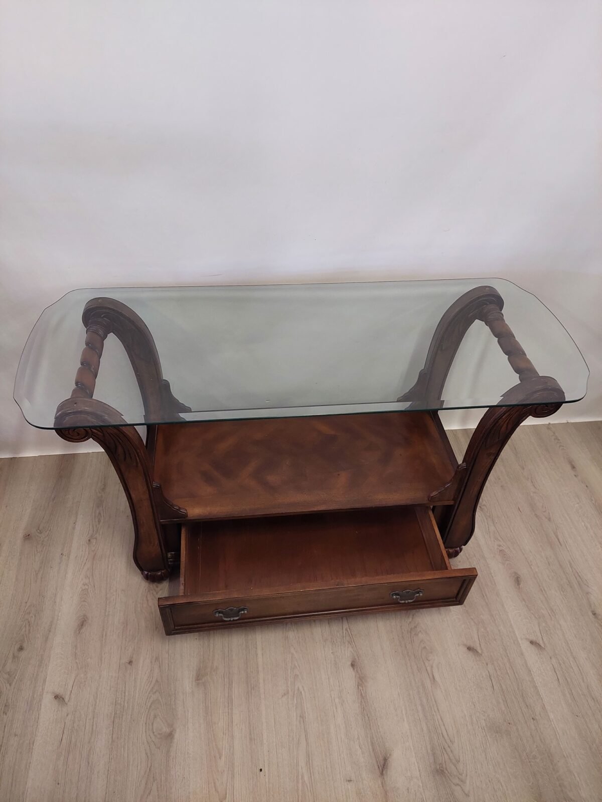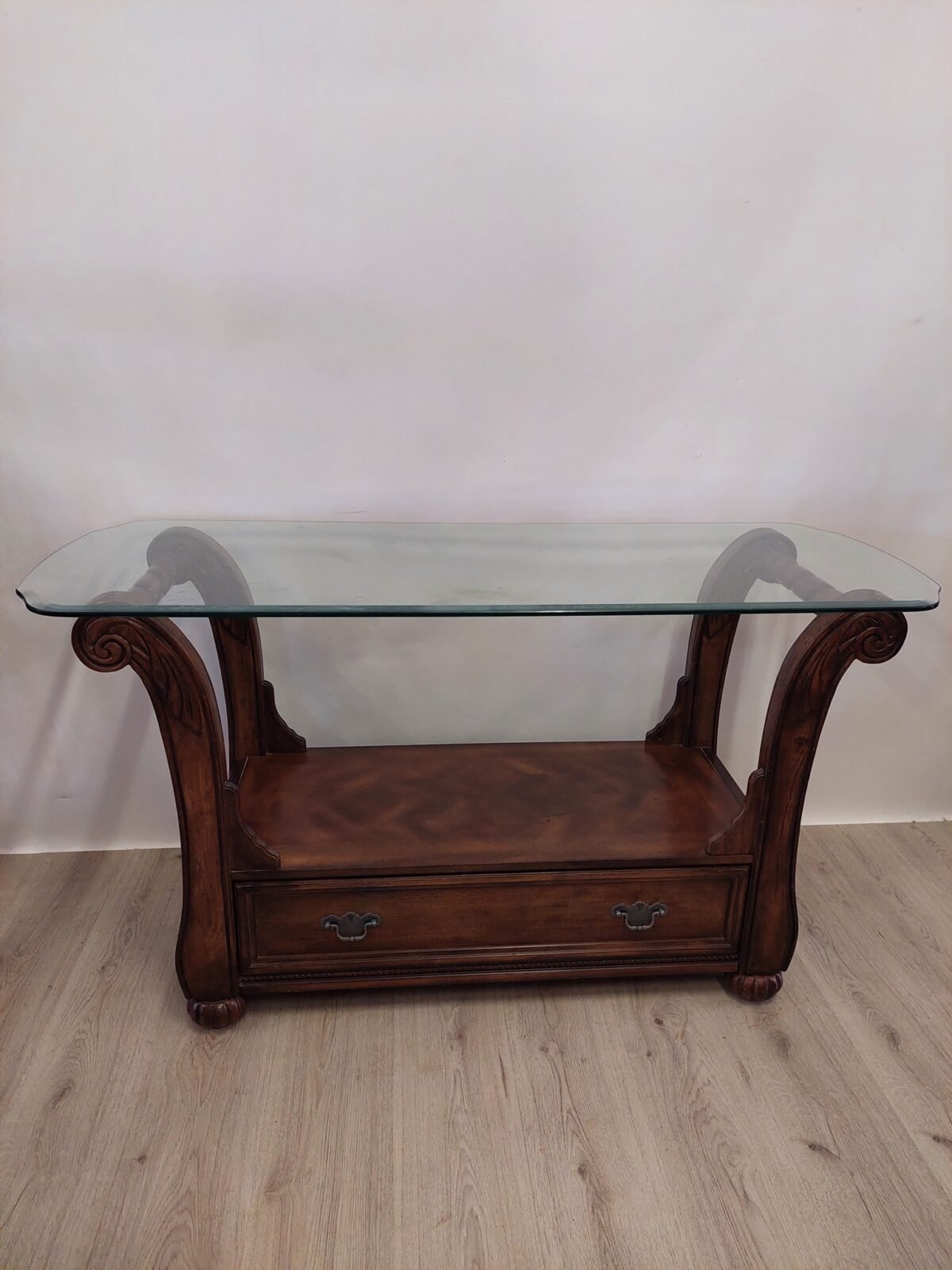 Daili koncolė, svetainės staliukas su stikliniu stalviršiu ir stalčiumi