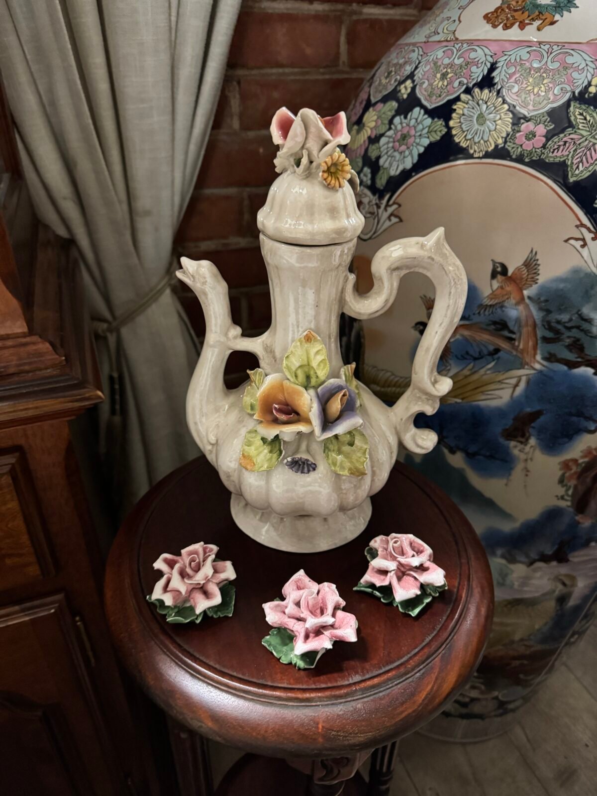 Dekoratyvinis arbatinukas puoštas gėlių dekoru