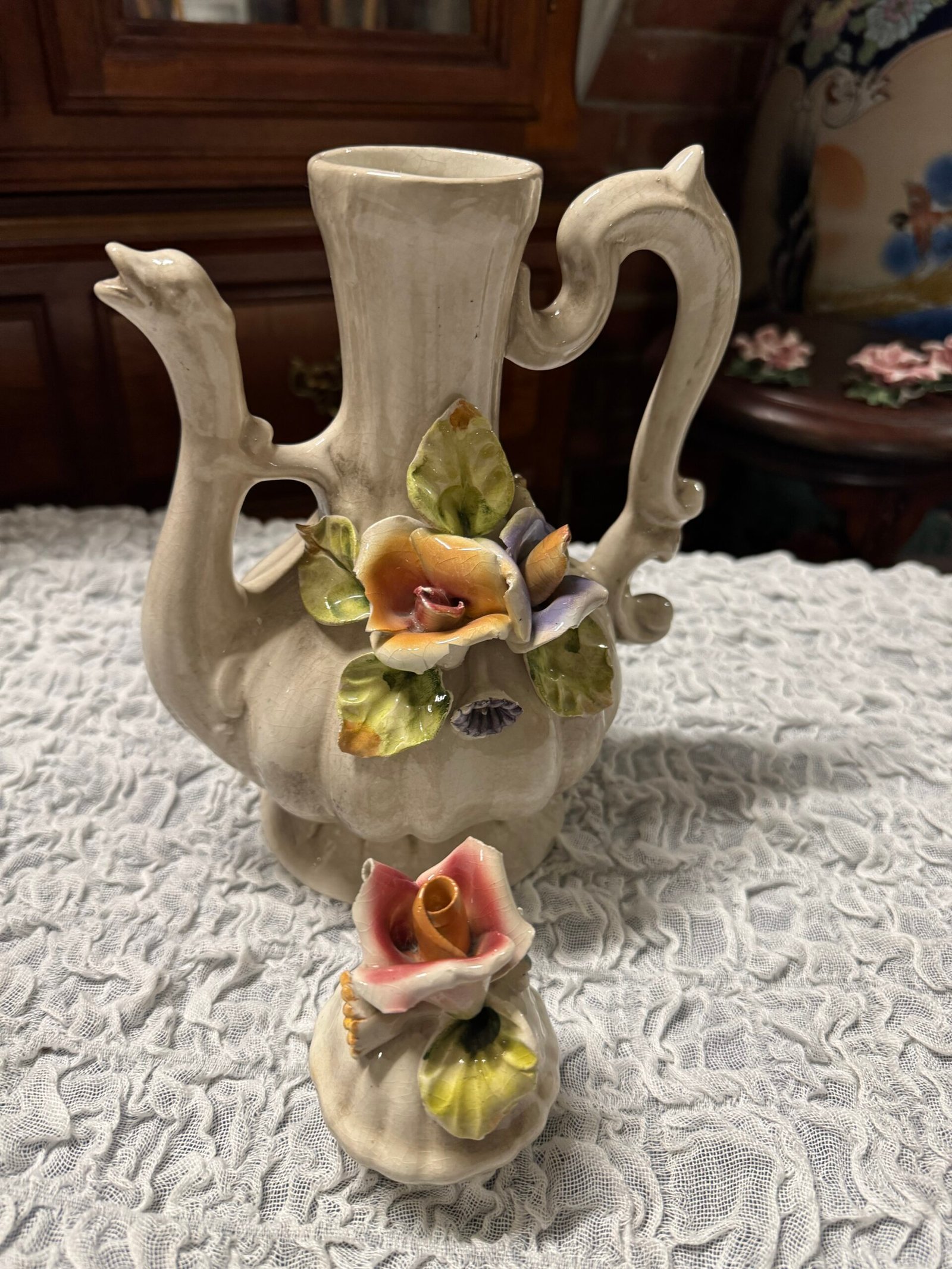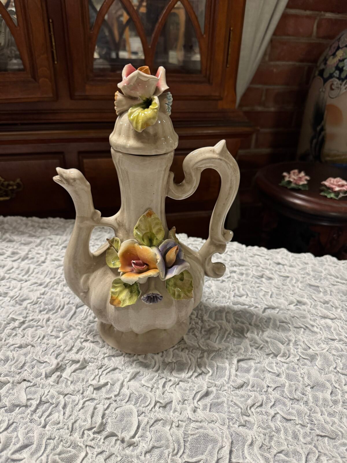 dekoratyvinis stalo papuošimo arbatinukas su gėlių dekoru
