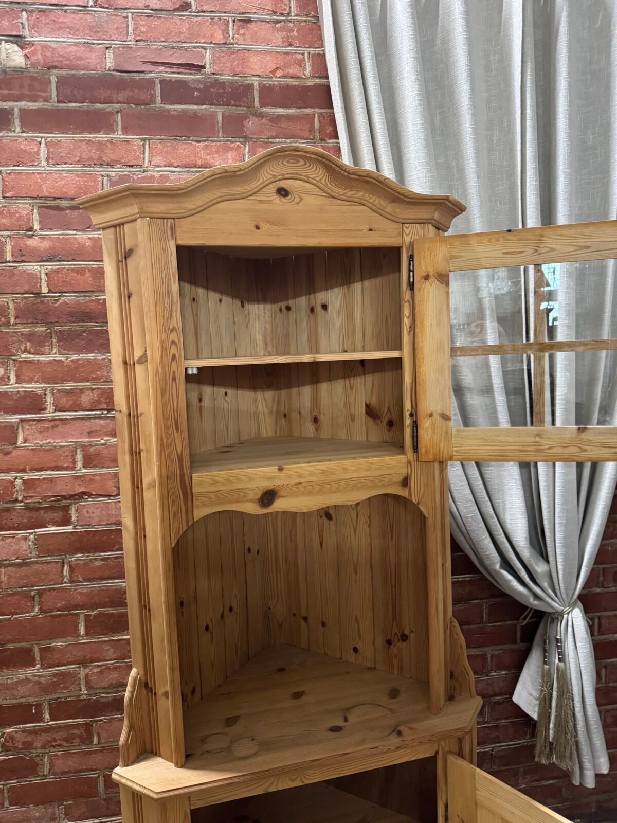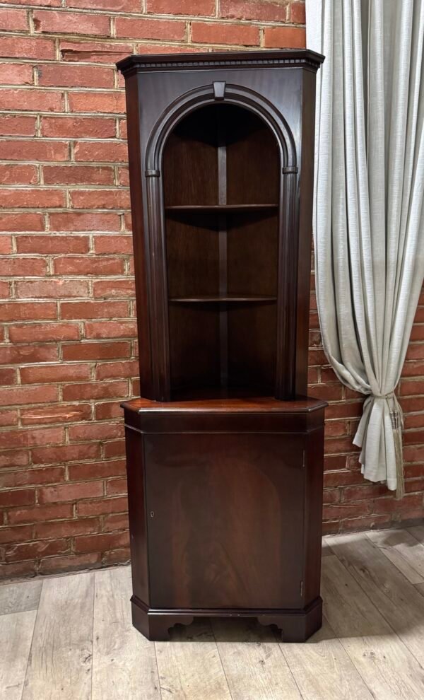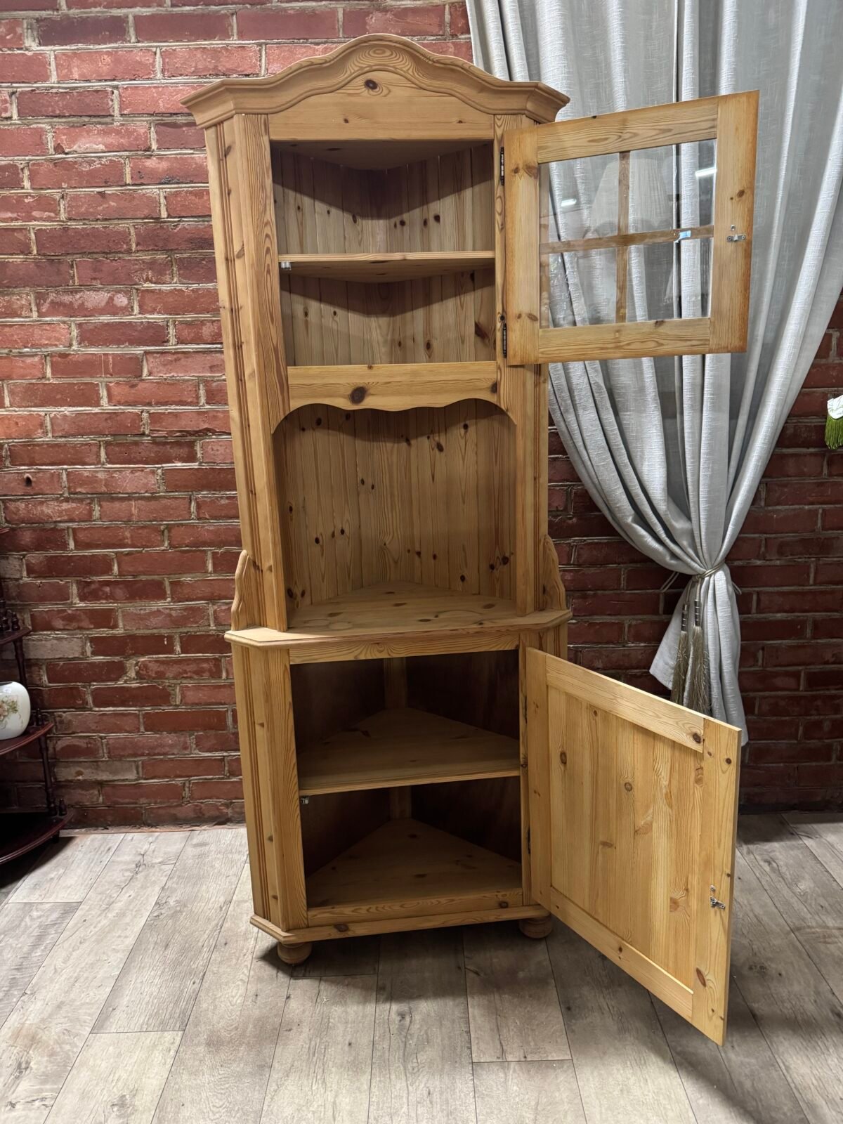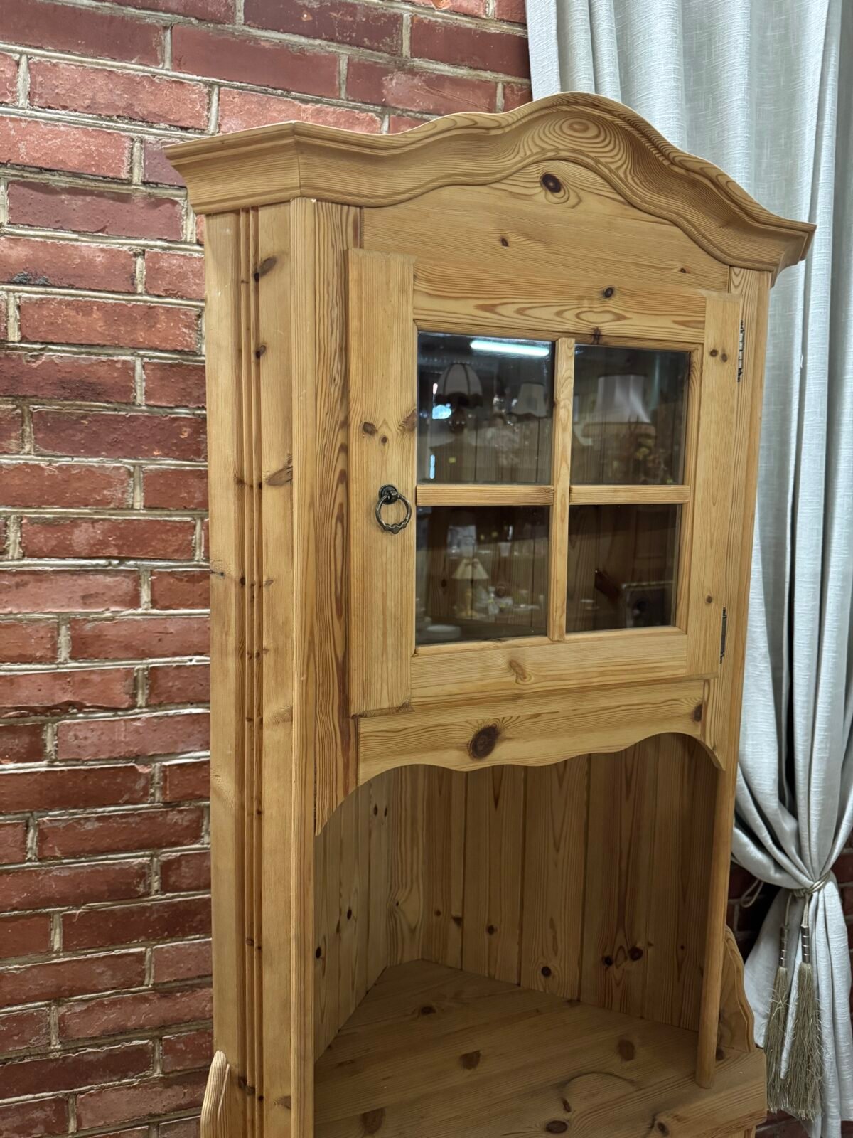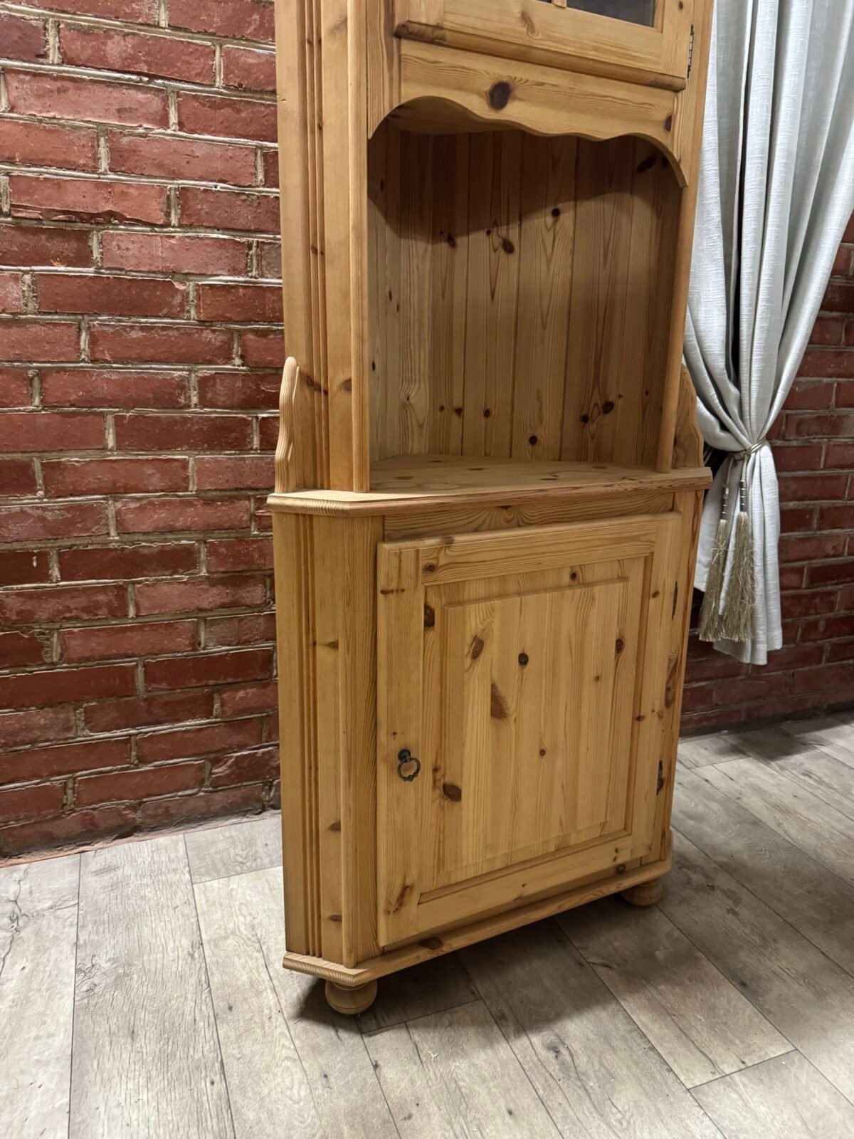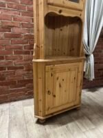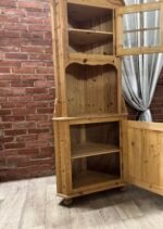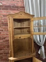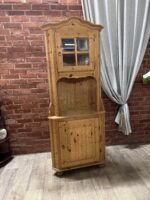 Daili kampinė vitrinėlė su vario detalėm ir riestom kojelėm