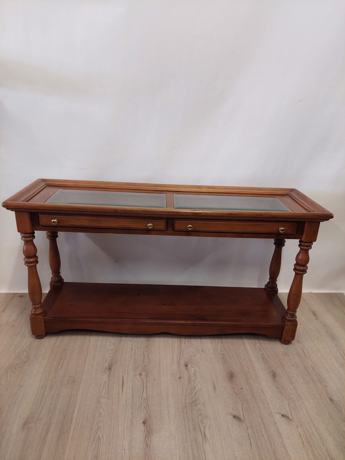 Klasikinio stiliaus koncolė su stalčiukais, lentyna ir stikliu stalviršiu