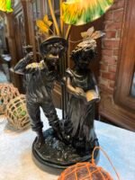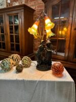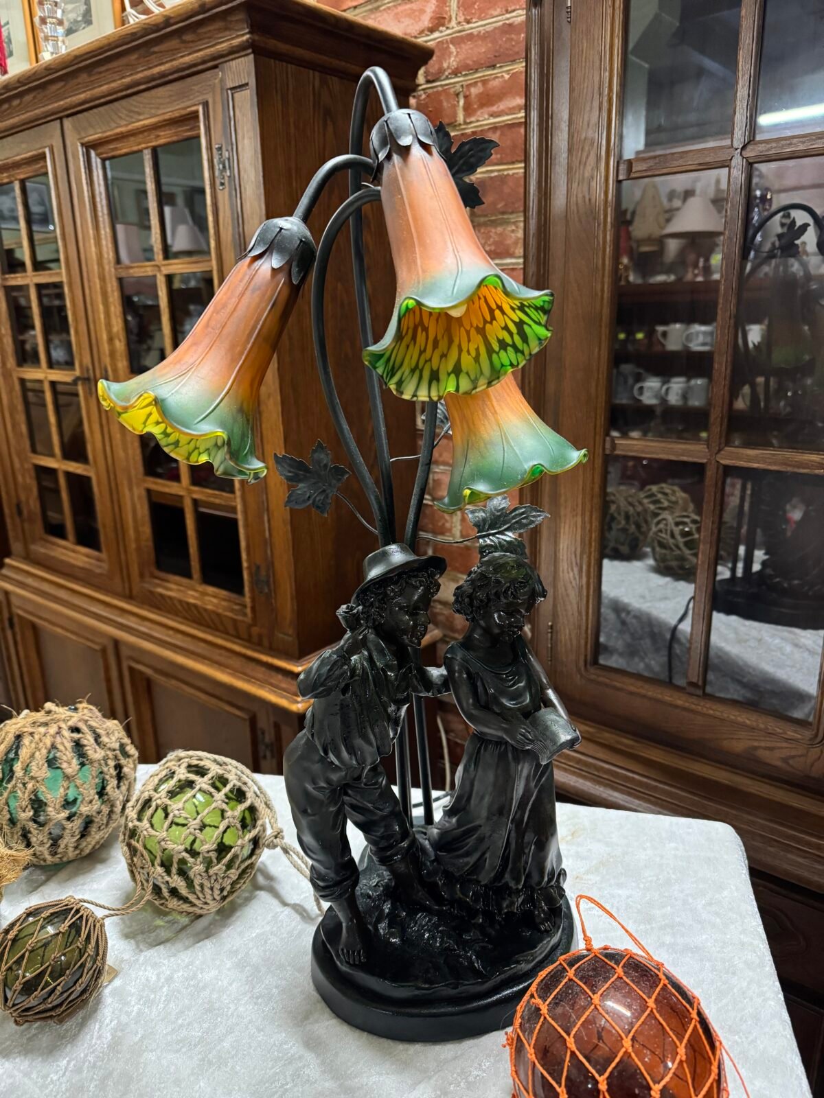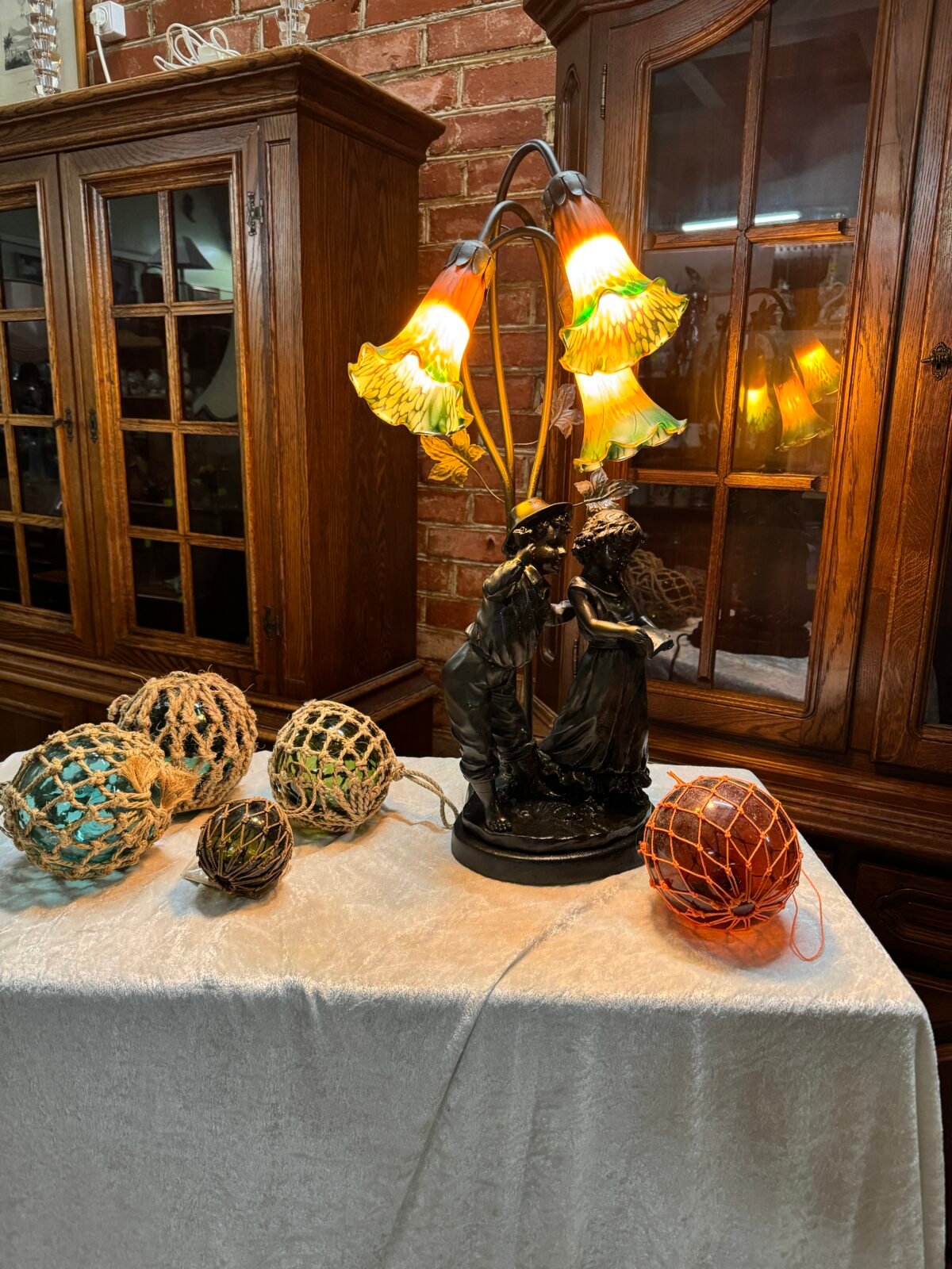 Stalinis šviestuvas keramikine su vario detalėmis koja ir stikliniu gaubtu
