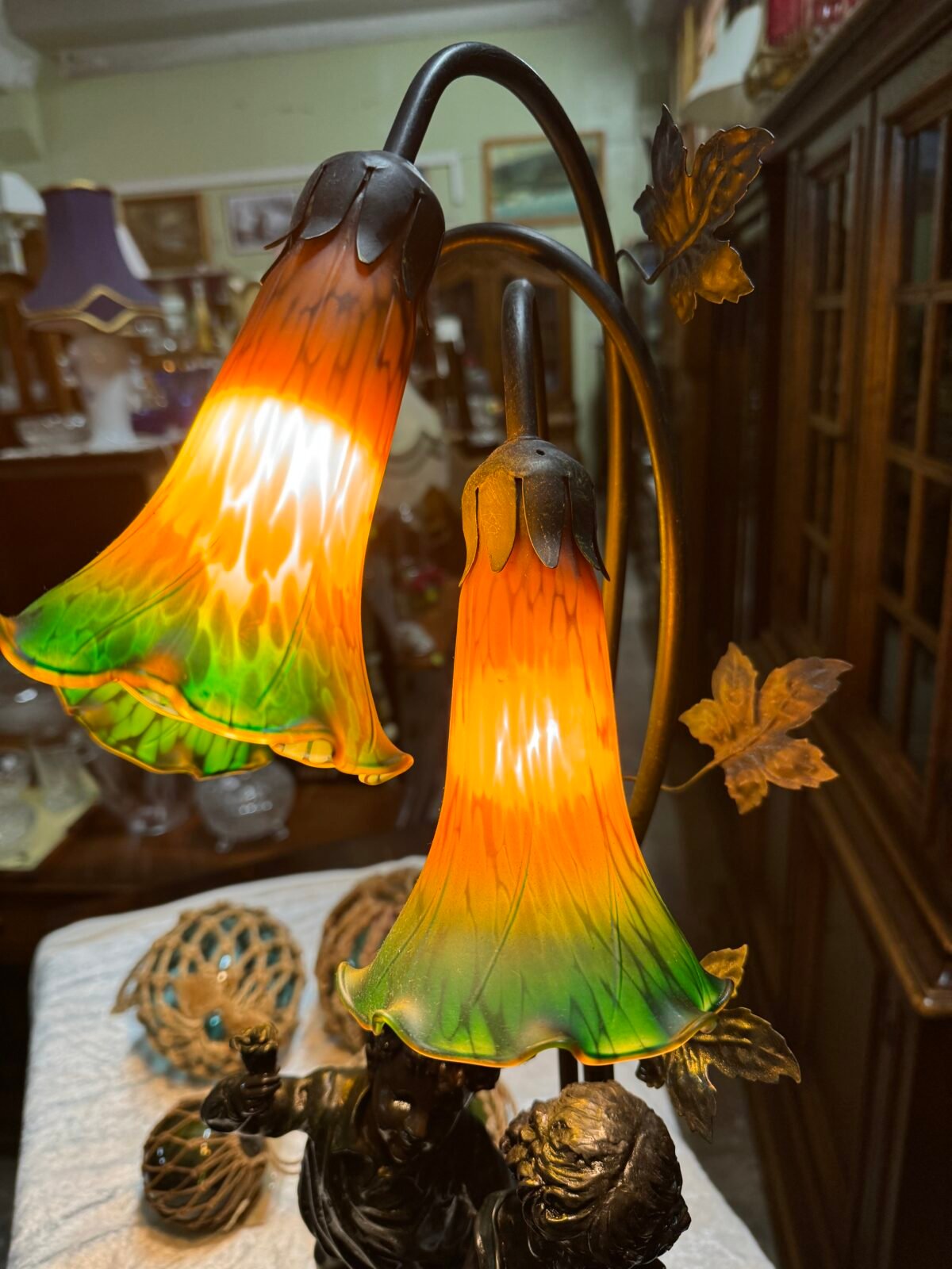 Metalo konstrukcijos dailus šviestuvas stikliniais spalvotais gaubtais
