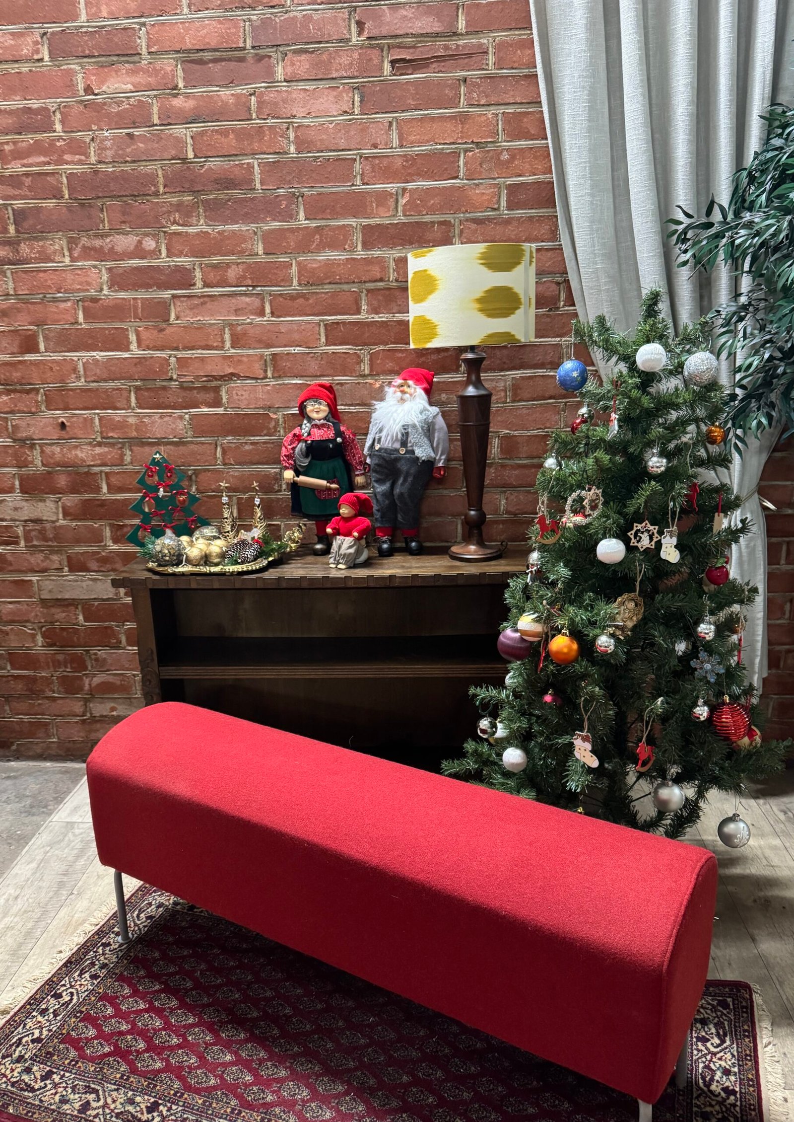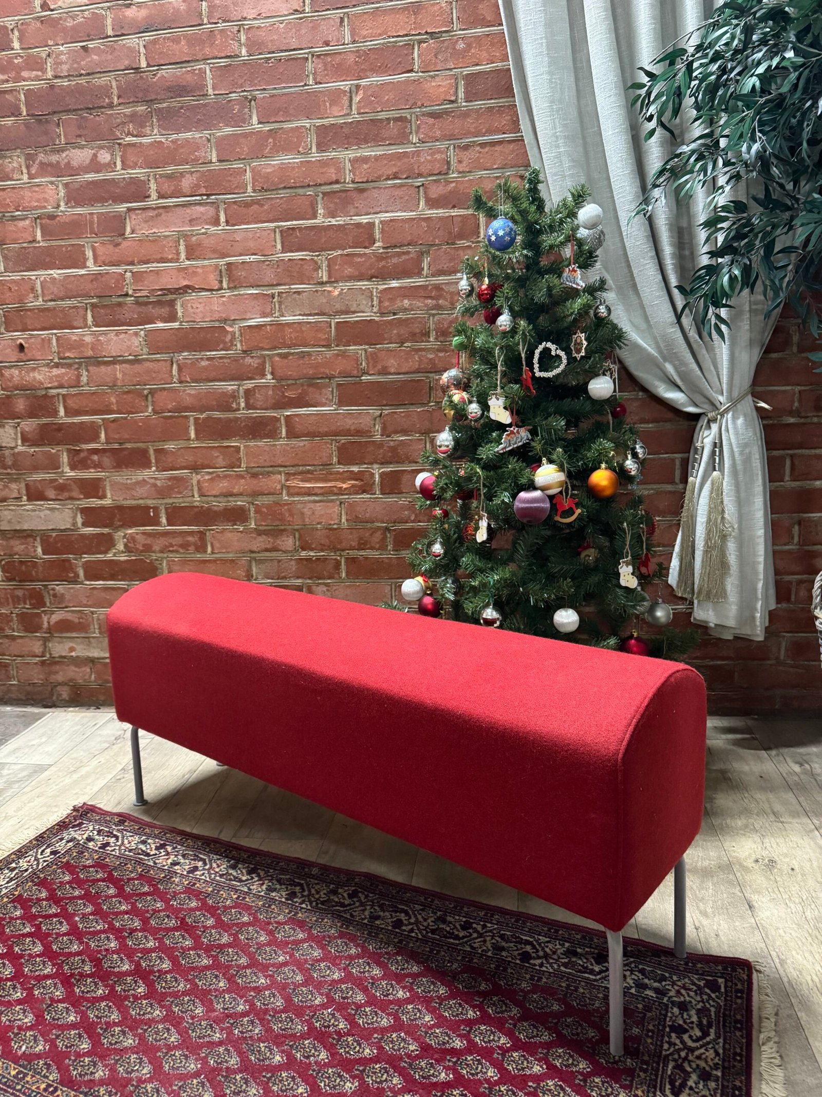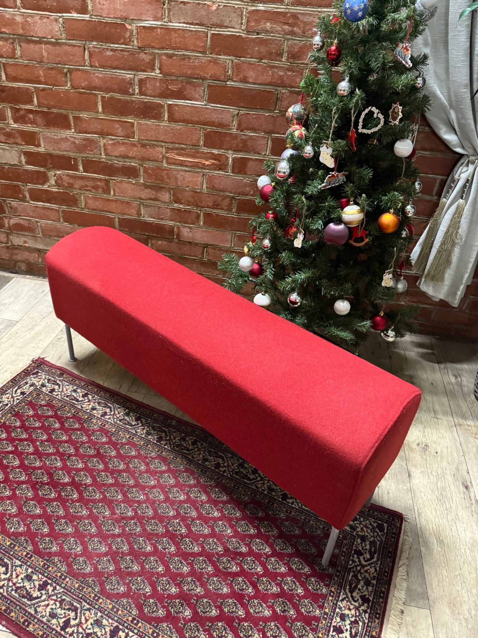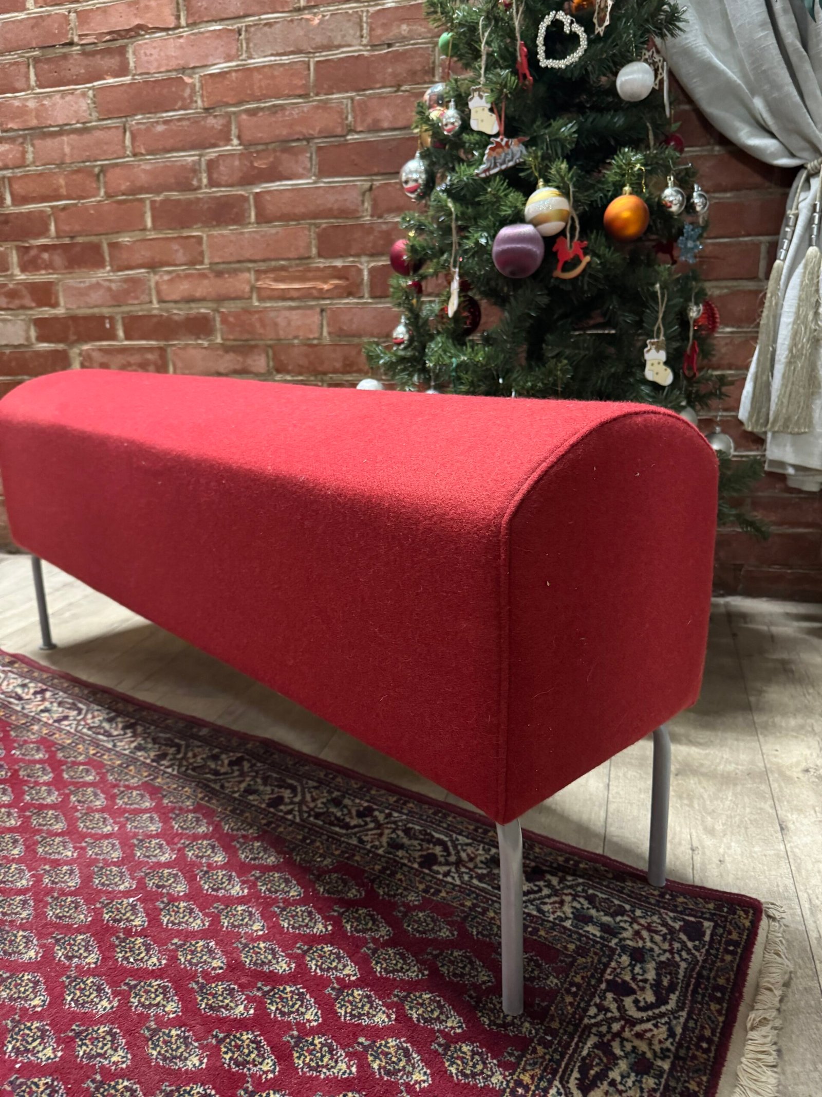 Minkštas suoliukas medžiaginiu gobelenu ir metalinėmis kojelėmis
