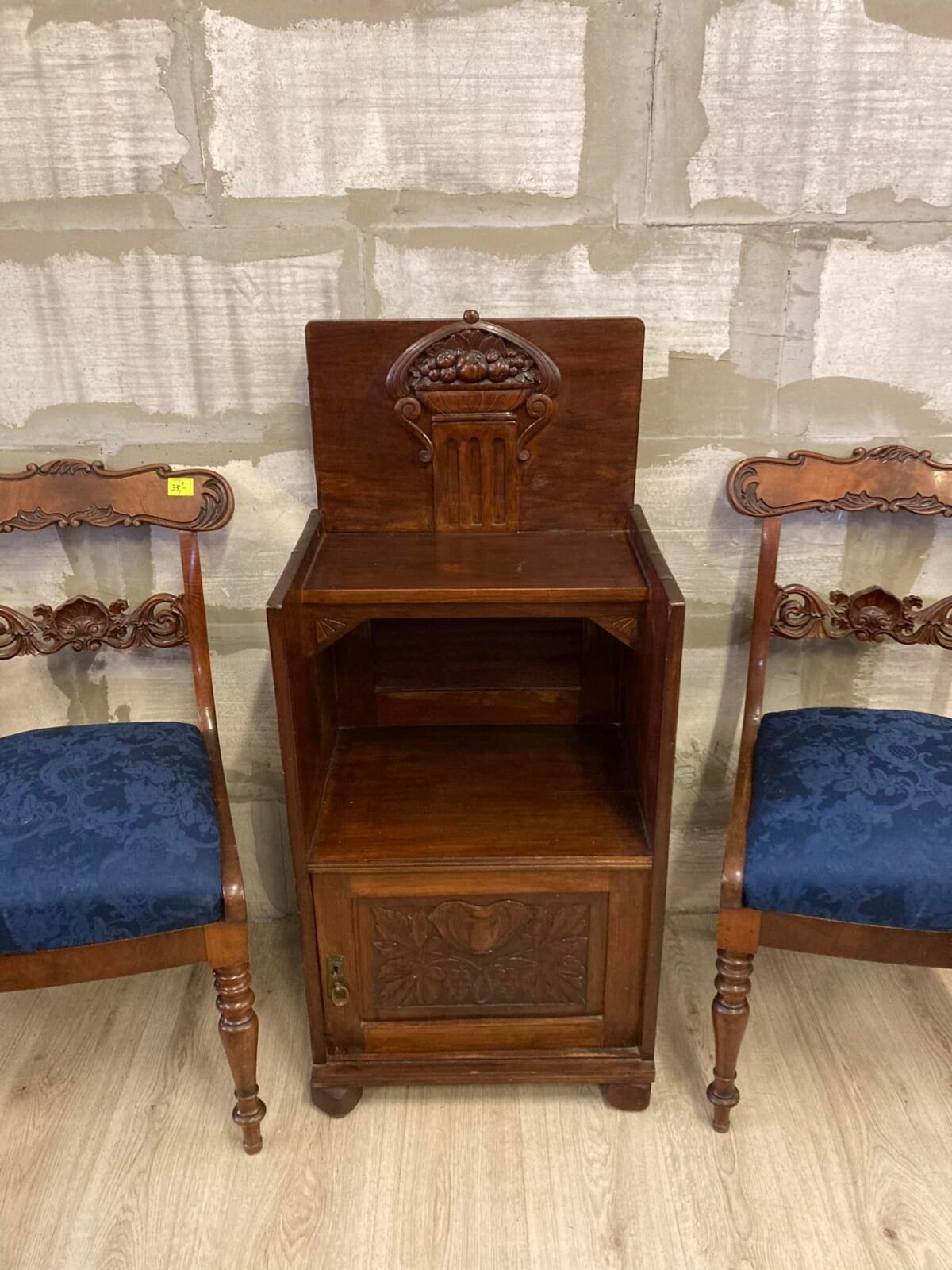 Senovinė komodėlė su užsirakinama lentyna, dailiais drožiniais
