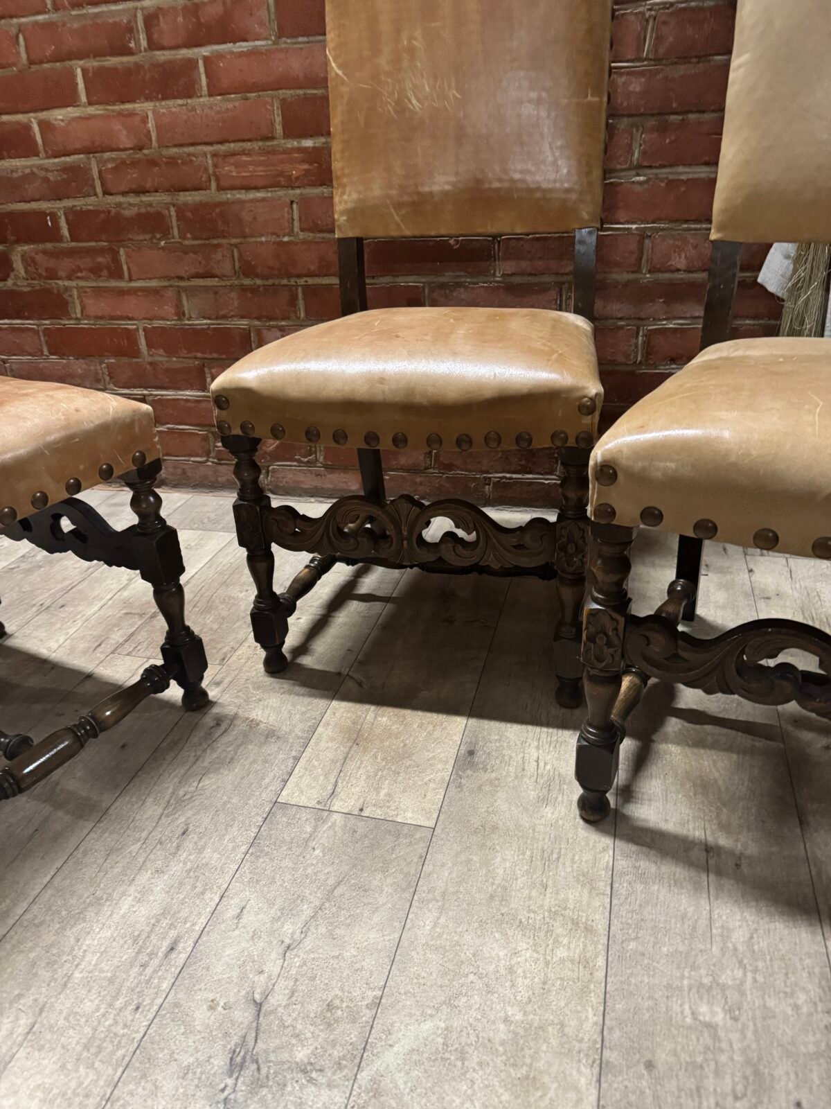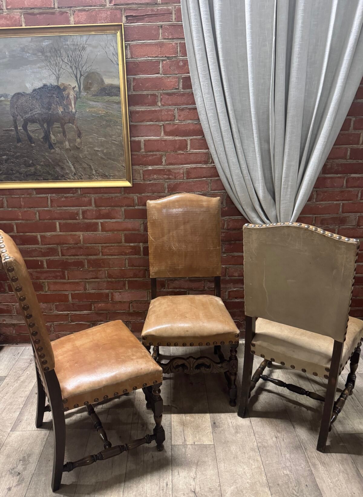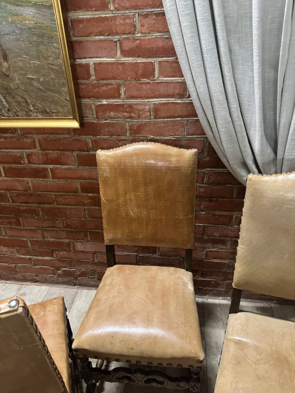 Senovinės tvirtos medinės kėdės naturalios odos gobelenu