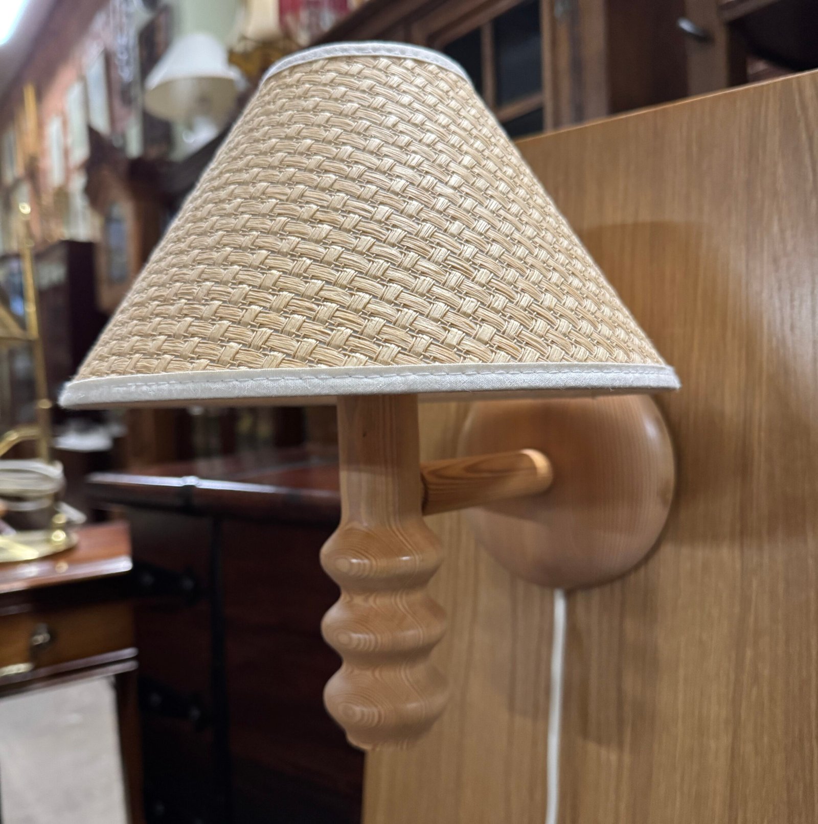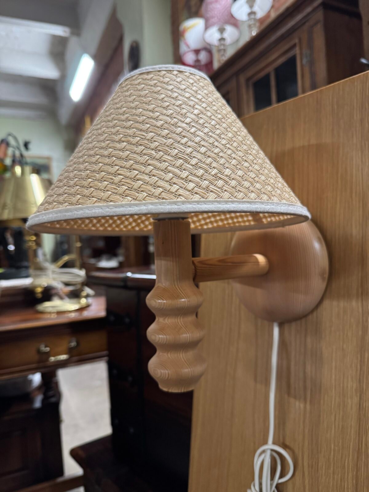 Sieninis šviestuvas medine konstrukcija ir medžiaginiu gaubtu