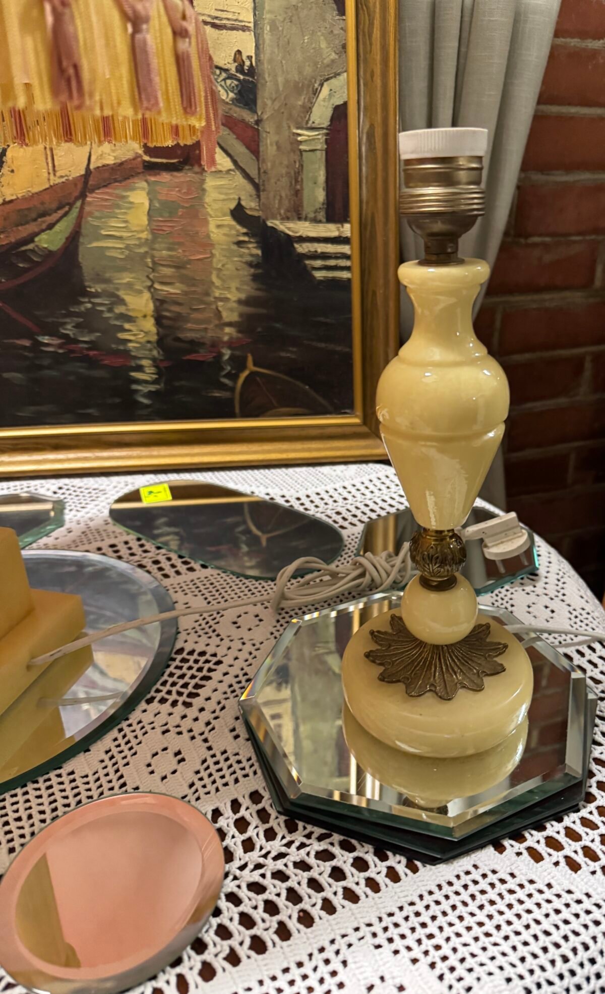 Šviestuvas metaline su onikso detalėmis koja ir naujai restauruotu medžiaginiu gaubtu