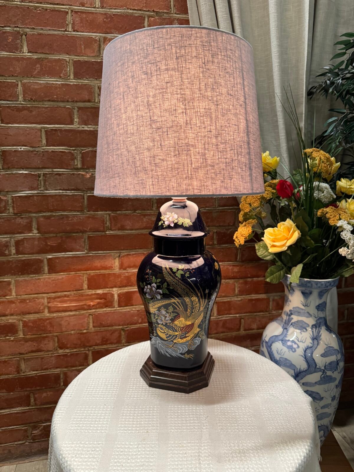 Stalinis šviestuvas onekso ir vario koja ir naujai restauruotu baltu su aukso spalvos juostelėm gaubtu