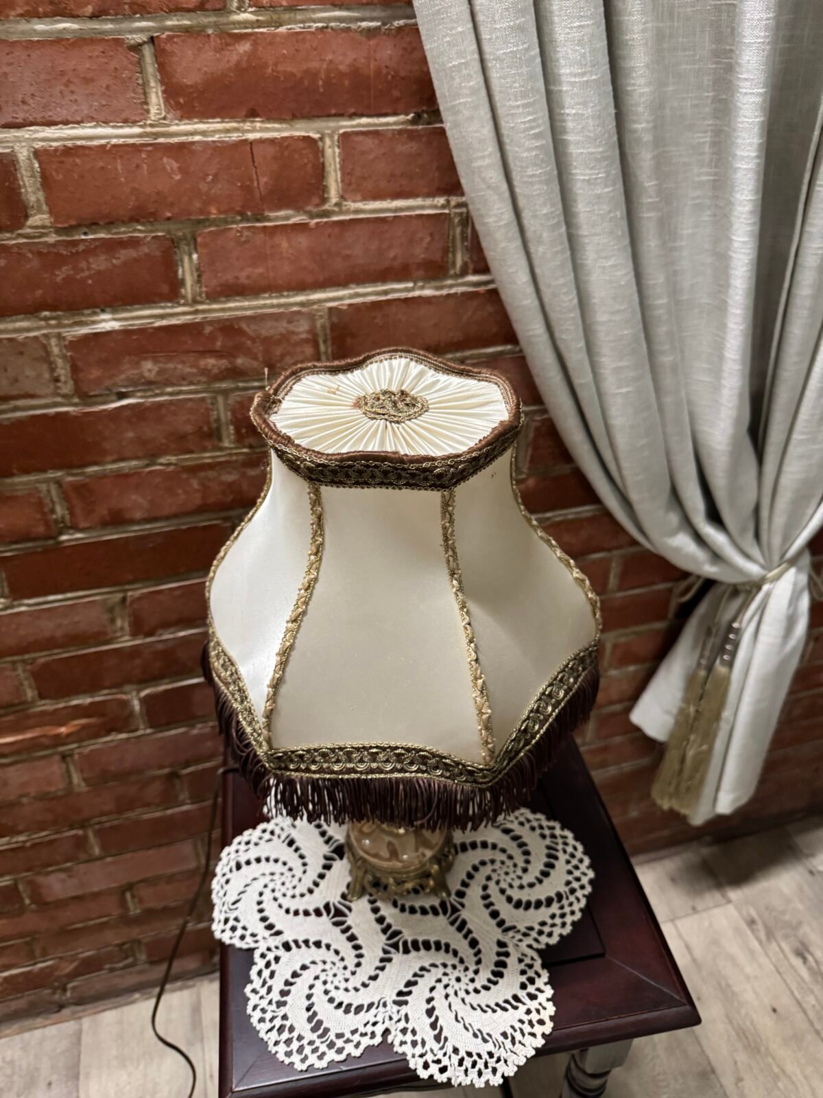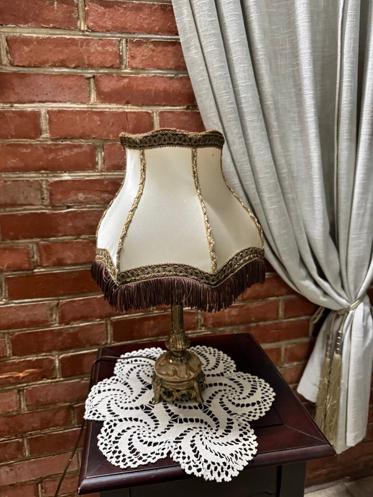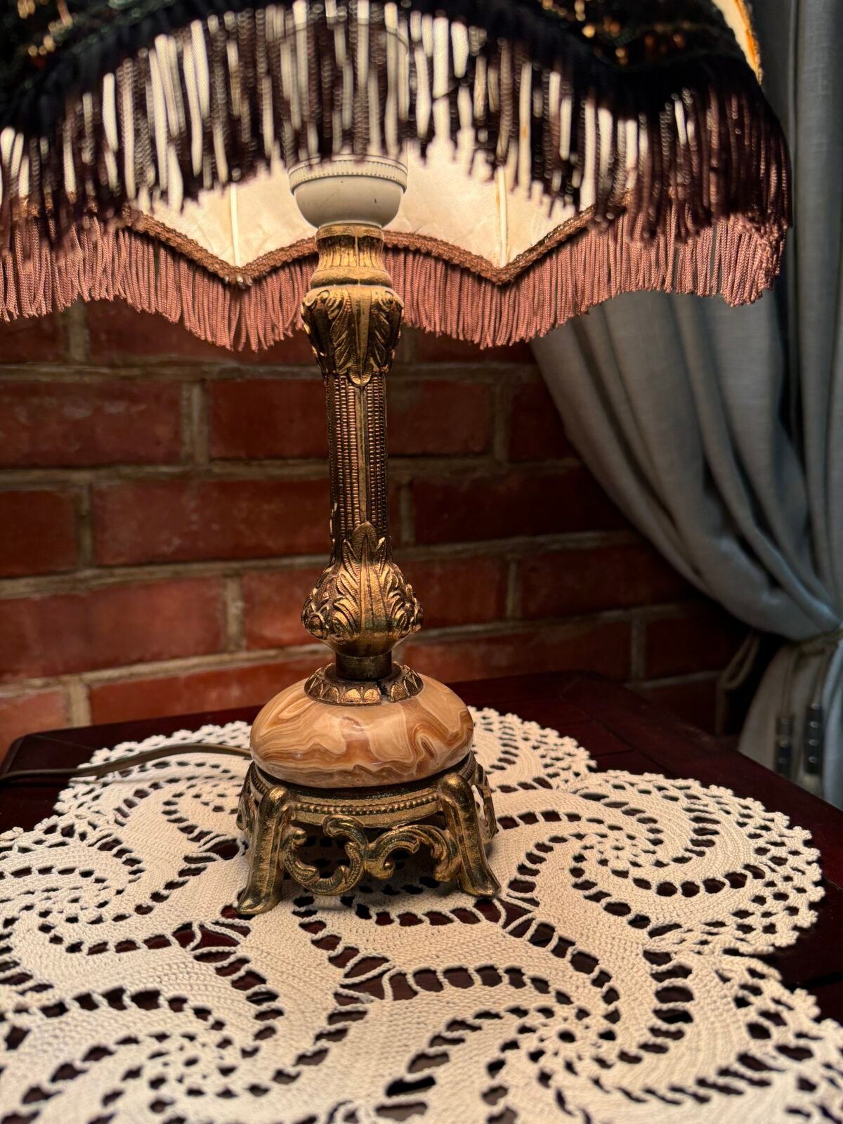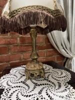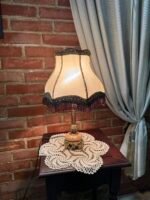 Varinė, dailia koja stalinė lempa su dailiu gaubtu