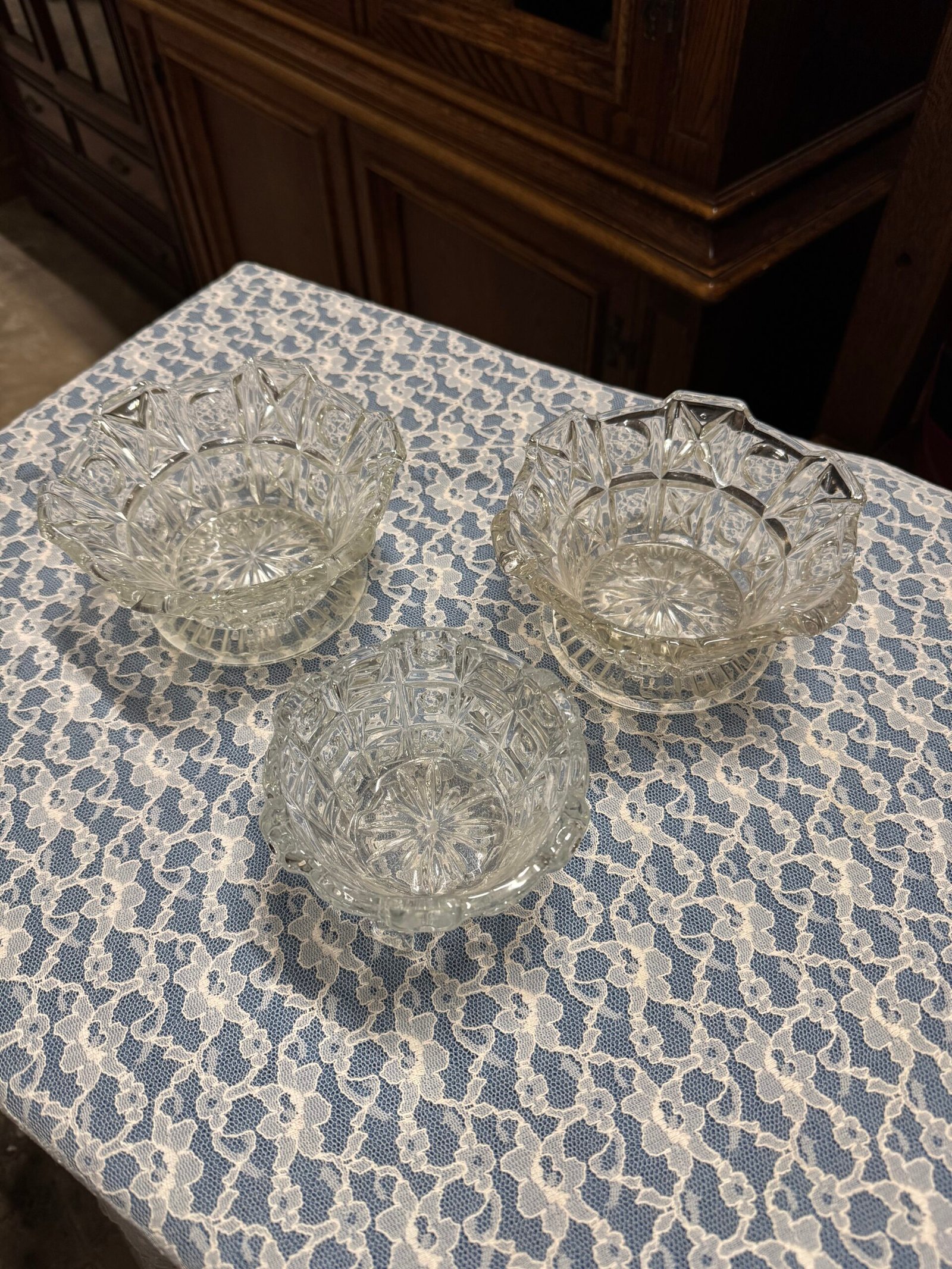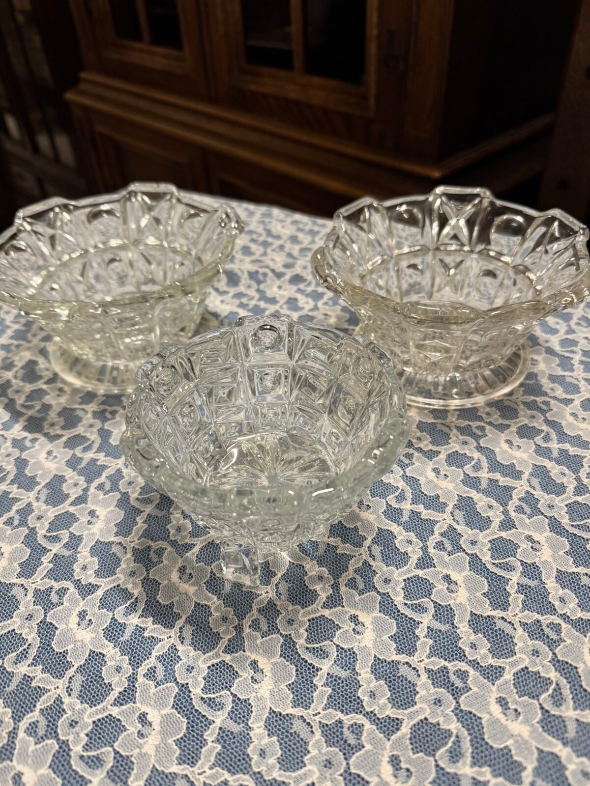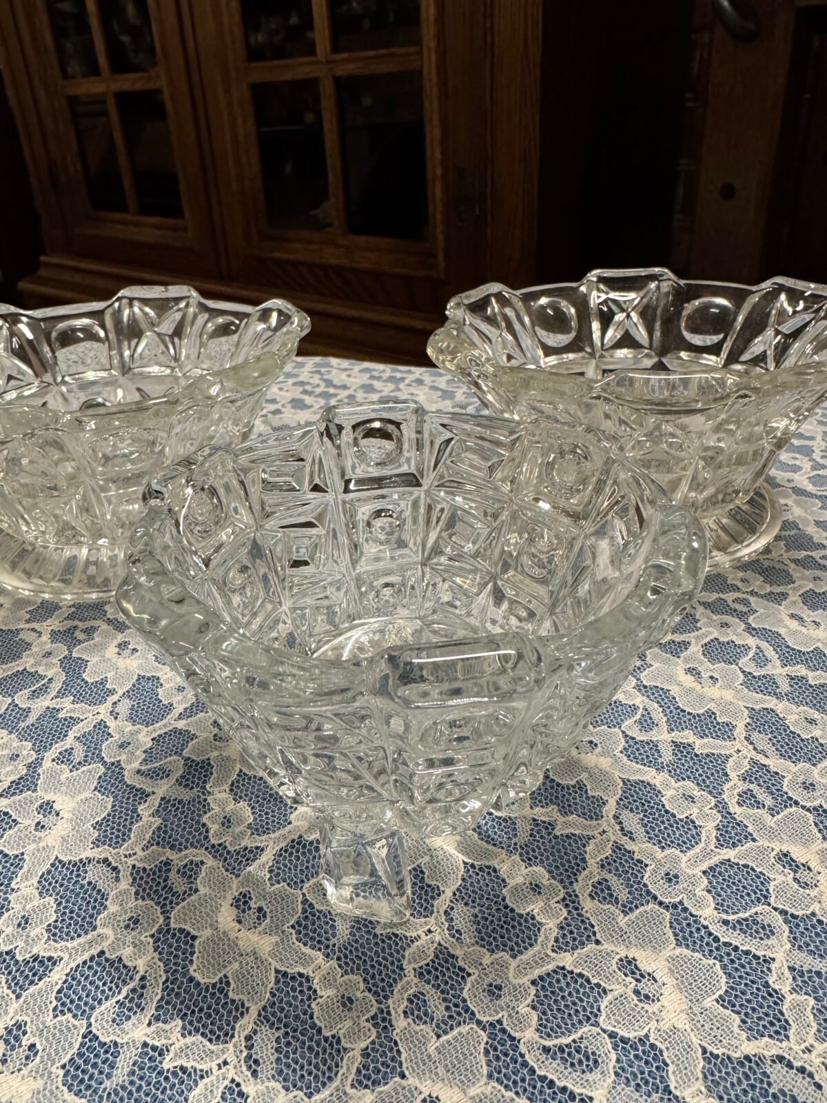 Trys vieno stiliaus stiklinės vazos stalo serviravimui