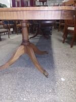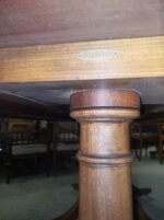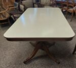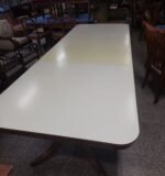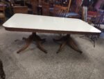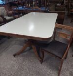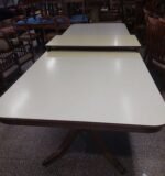 Valgomojo stalas medinėmis dailiomis kojomis kaustytomis varinėmis detalėmis ir baltu faneruotu stalviršiu