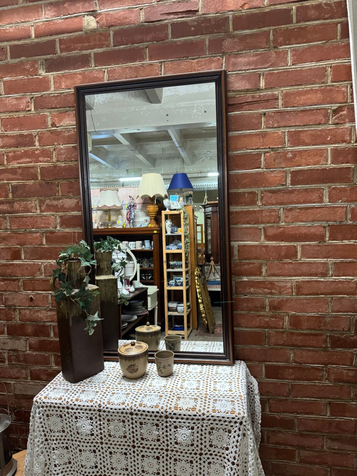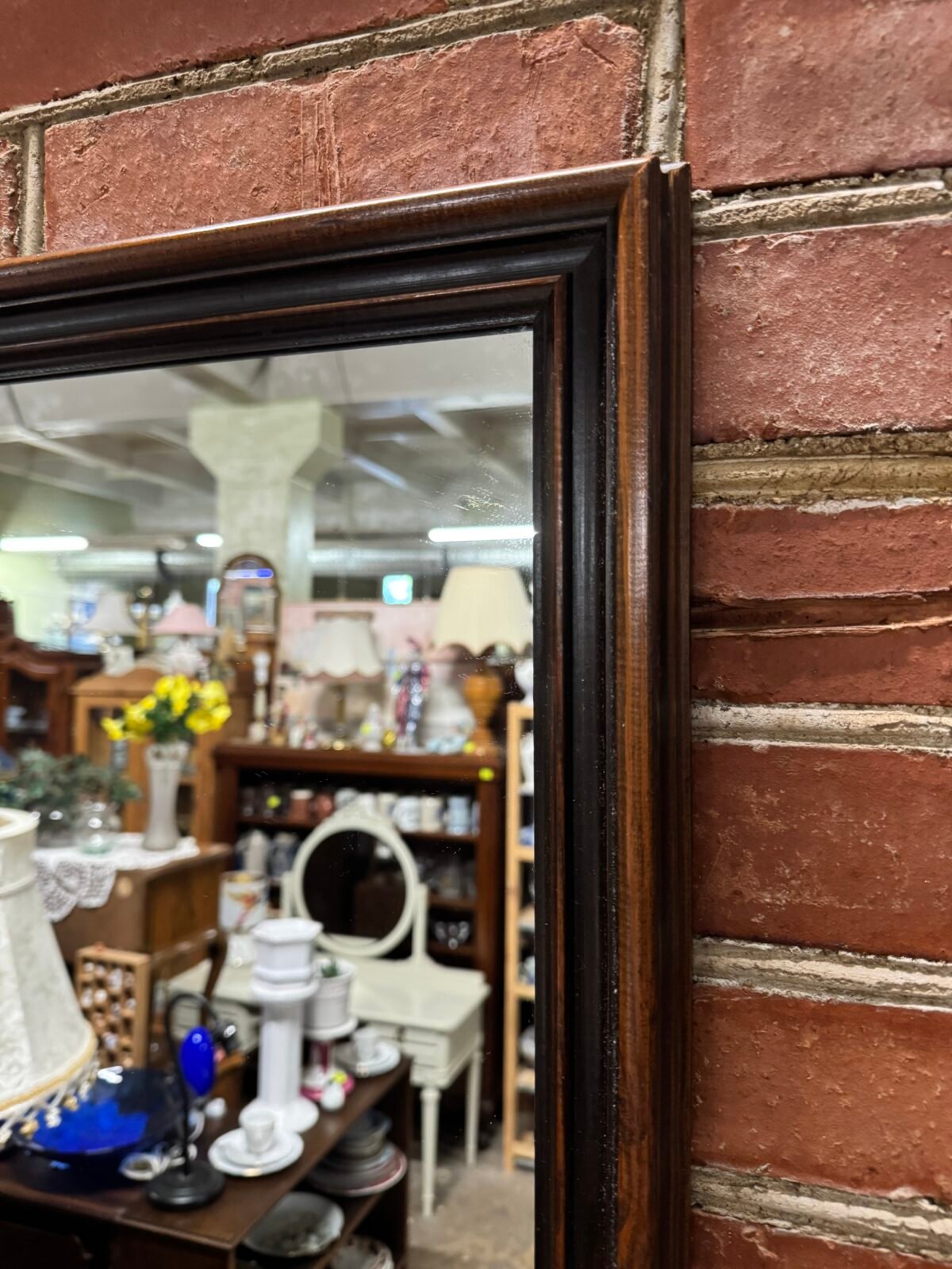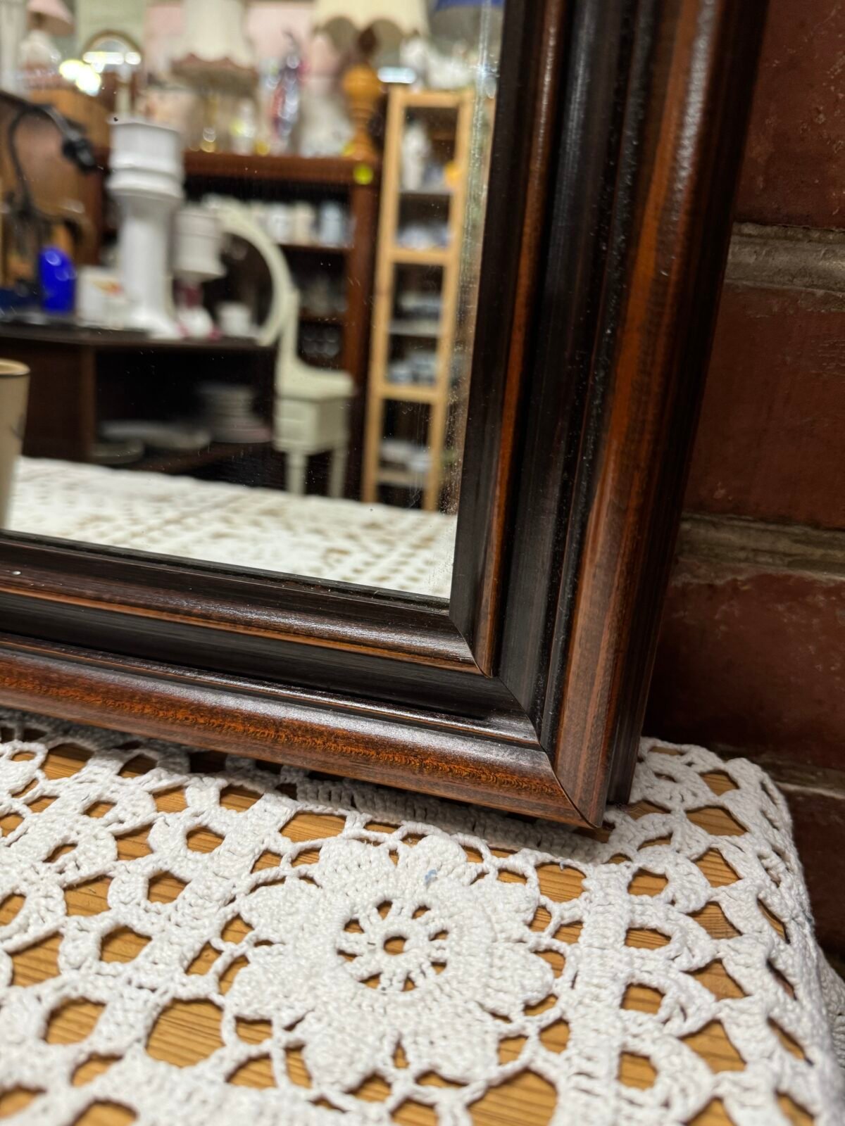 Didelis vartomas veidrodis mediniu rėmu įtvirtintas mediniame rėme