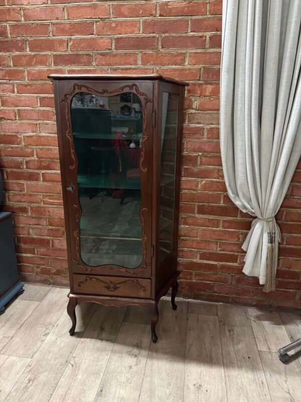 Daili kampinė vitrinėlė su vario detalėm ir riestom kojelėm