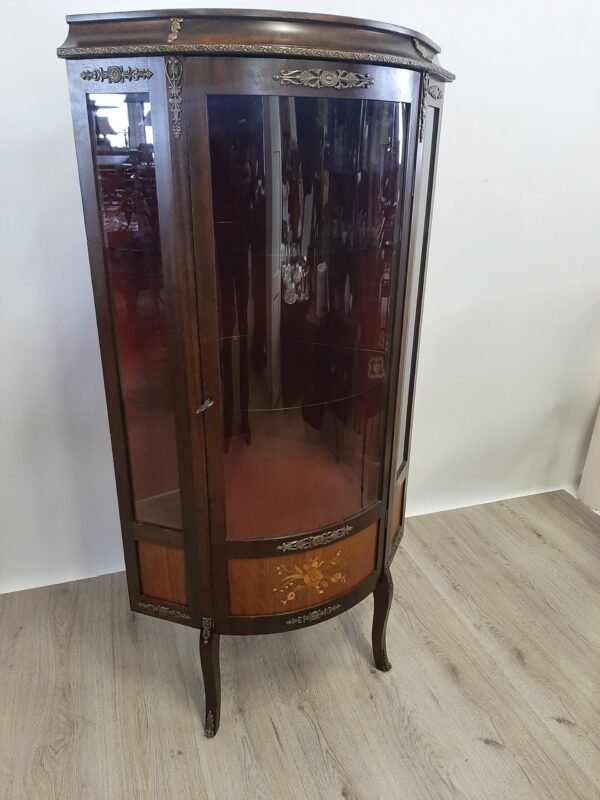 Daili kampinė vitrinėlė su vario detalėm ir riestom kojelėm